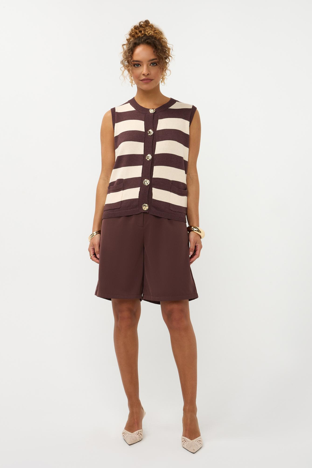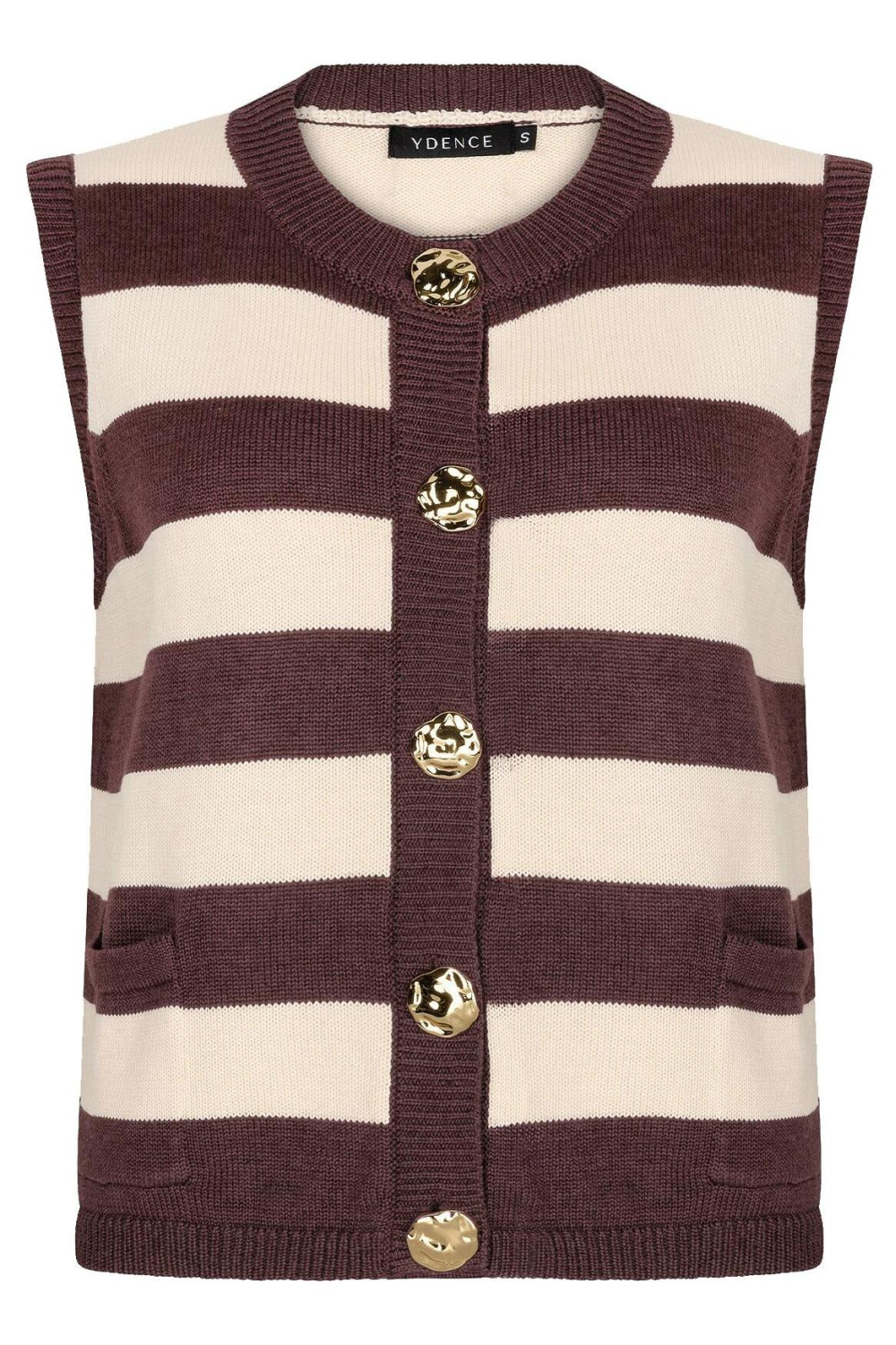 Dit Ydence gilet is een stijlvol item dat niet mag ontbreken in je zomercollectie. Met een regular pasvorm en een moderne knitwear stijl, biedt dit gilet comfort en mode in één. De opvallende bruin-witte strepen zorgen voor een speelse touch, terwijl de stevige knoopsluiting met goudachtige knopen een elegante uitstraling geeft. Het gilet is voorzien van handige steekzakken en is mouwloos, ideaal voor warmer weer. De ronde halslijn voegt een klassiek element toe aan het eigentijdse design. Gemaakt van een mix van acryl en katoen, is het gilet licht en comfortabel te dragen. Of je nu een casual dag doorbrengt of een semi-formeel evenement bezoekt, dit Ydence gilet voegt een chique accent toe aan je outfit. Combineer het met een witte blouse voor een frisse look of draag het over een jurk voor een laagje extra stijl. Dit veelzijdige gilet past perfect in zowel zakelijke als informele settings, waardoor je altijd stijlvol voor de dag komt.