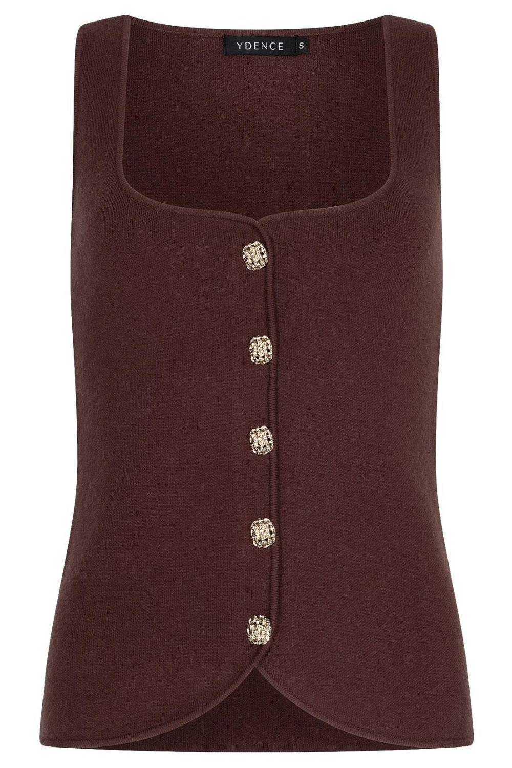 Deze stijlvolle bruine knitwear top van Ydence voegt een eigentijdse touch toe aan je zomergarderobe. Het mouwloze ontwerp, gecombineerd met een flatterende vierkante hals, zorgt voor een lichte en ademende pasvorm. De knoopjes aan de voorkant voegen subtiele elegantie toe en de effen bruine kleur maakt het gemakkelijk te combineren met diverse outfits. Het materiaal van 70% viscose en 30% nylon biedt een zachte, comfortabele draagervaring voor warme zomerdagen. De regular fit maakt deze top perfect voor uiteenlopende gelegenheden, van een casual dagje uit tot een zomers feestje. Je kunt het moeiteloos combineren met een luchtige rok of je favoriete jeansshorts. Of je nu een ontspannen dag aan het strand doorbrengt of een stadswandeling maakt, met deze Ydence top zie je er altijd verzorgd uit. De normale lengte garandeert een tijdloze look die bij elke stijl past.