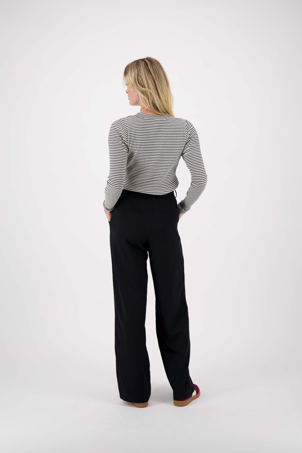 Deze stijlvolle zwarte damesbroek van Zusss is een perfecte aanvulling op je wintergarderobe. Gemaakt van een mix van 87% polyester en 13% elastan, biedt deze broek een comfortabele pasvorm met voldoende flexibiliteit. De straight fit en de regular waist zorgen voor een tijdloze en elegante uitstraling. De broek heeft een klassieke knoop- en ritssluiting, terwijl de praktische steekzakken een functioneel element toevoegen. De brede tailleband met een opvallende metalen ring maakt deze broek net even anders. De zwarte kleur maakt deze Zusss broek veelzijdig en gemakkelijk te combineren met verschillende stijlen. Voeg een casual top toe voor een ontspannen look of ga voor een meer geklede uitstraling met een blouse en blazer. De broek is ideaal voor een dag op kantoor, maar komt ook goed tot zijn recht tijdens een lunch met vrienden. De normale lengte en de vloeiend vallende stof geven je outfit een moeiteloze en chique touch, perfect voor diverse gelegenheden.